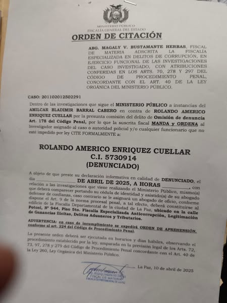Según la denuncia presentada por Barral, Cuéllar no habría cumplido con su obligación de reportar presuntos delitos, en concordancia con el artículo 178 del Código Penal boliviano. El diputado fue citado para declarar el 18 de abril de 2025 ante la Fiscalía Especializada en Delitos de Corrupción de La Paz.