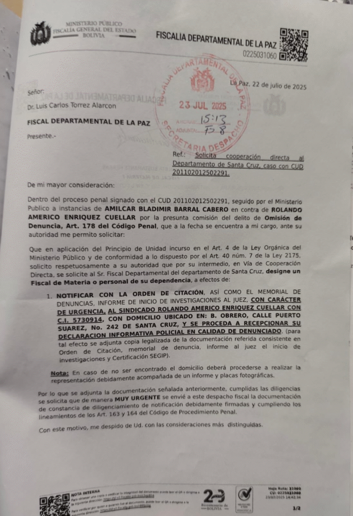 La Paz, 16 de septiembre de 2025.– El exdiputado Amílcar Barral solicitó a la Fiscalía la aprehensión del diputado Rolando Américo Enríquez Cuéllar, tras no presentarse a una citación programada por el Ministerio Público en el marco de una investigación por presunta omisión de denuncia en un caso de proxenetismo en la Asamblea Legislativa.